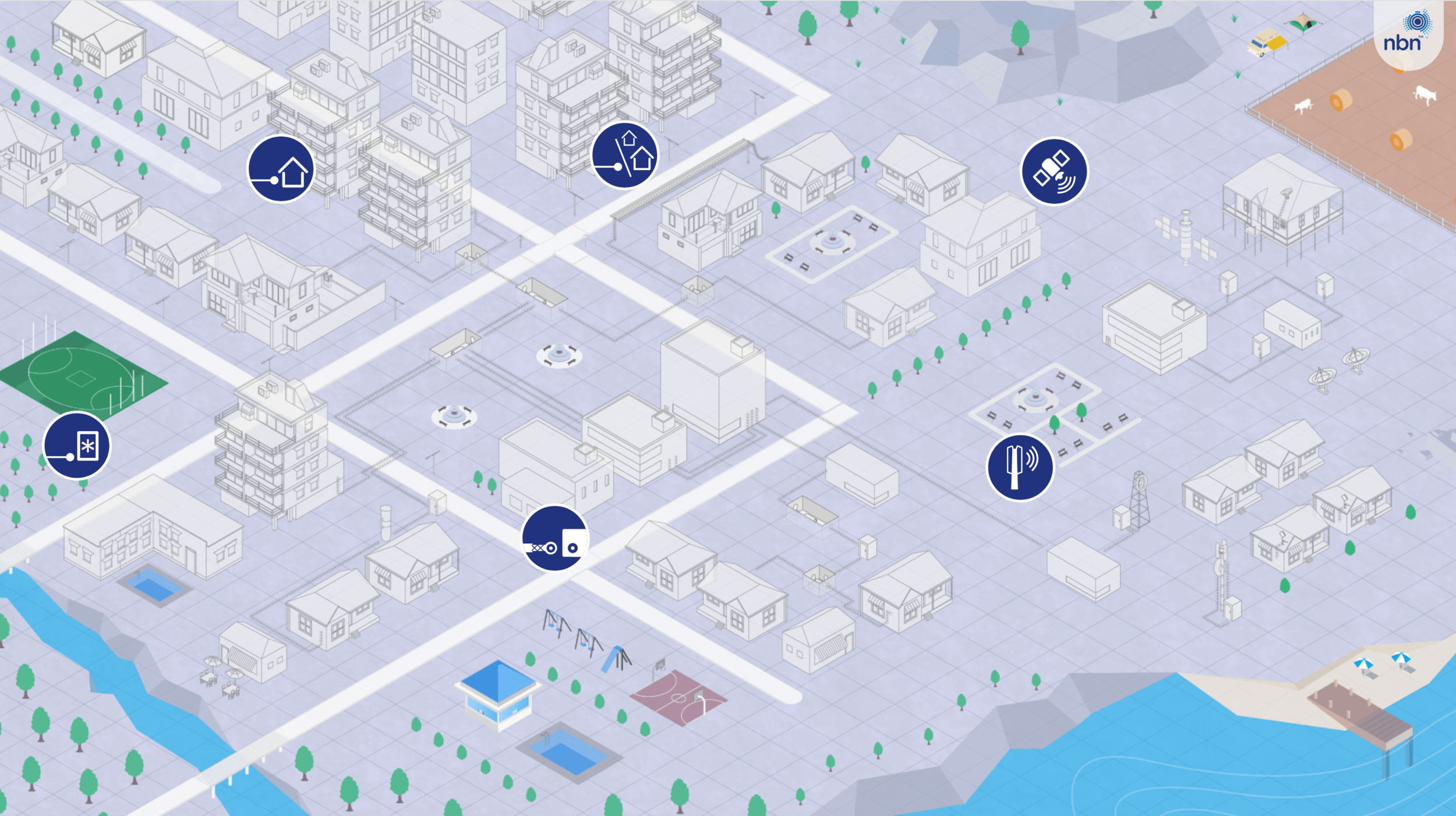 Because the learning needed to shine a light on how the parts fit together, we created a 3D virtual city that was without colour, or “unconnected” at the start. As you clicked on each part of the city and learnt how the nbn works in that district, that part of the city transforms to colour and technology makes the static move. As you learnt “how it all connects” you bring the city to life.